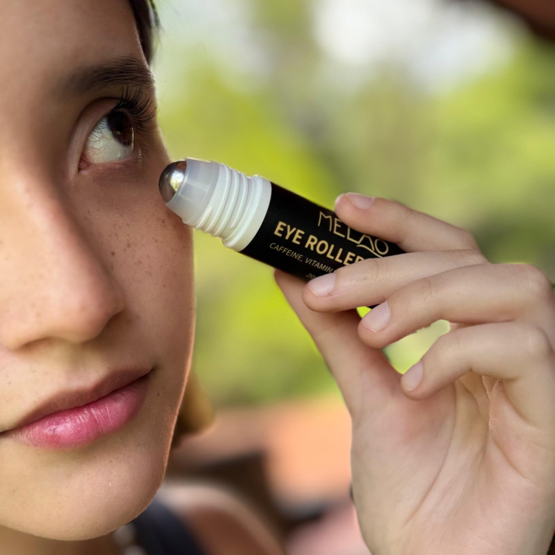 A base de caffeina que irriga el ojo para bajar la hinchazon, vitamina c como antioxidante y acido hialuronico para humectar lineas de expresion. Se aplica alrededor del ojo dando leves masajes con el roll on